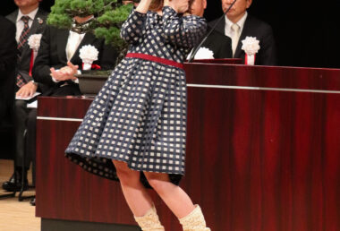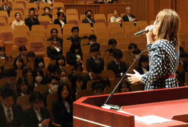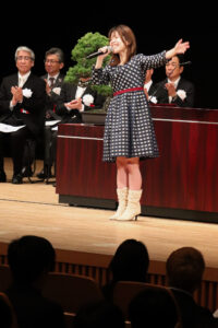 また、学園歌斉唱では、学園歌の作詞・作曲を手がけた南九州短期大学卒業生でシンガーソングライターの永吉愛さんが登壇。ステージにて、心を込めて学園歌を披露してくださいました。