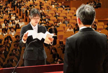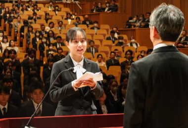 当日は春のやわらかな日差しに包まれながら、多くの新入生が新たな一歩を踏み出しました。式では、新入生を代表して、学部・大学院からそれぞれ1名が力強く宣誓を行い、新たな決意を胸にしました。