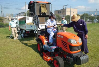 学生達は、乗用草刈り機での刈り取り体験はありましたが、1台で刈り取りから排出までを行えるタイプの使用は初めてでした。操作性の容易さと一連の作業時間の早さに驚いていました。また、刈り取り時の操作ミスによる事故を防ぐ為の安全装置にも、関心を寄せていました。