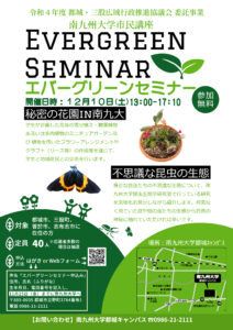 身近な昆虫たちの不思議な生態について、南九州大学昆虫生態学研究室で行っている研究を実物をお見せしながら紹介します。何気なく見ていた庭や畑の虫たちの生態から自然の神秘に触れていただければ幸いです。