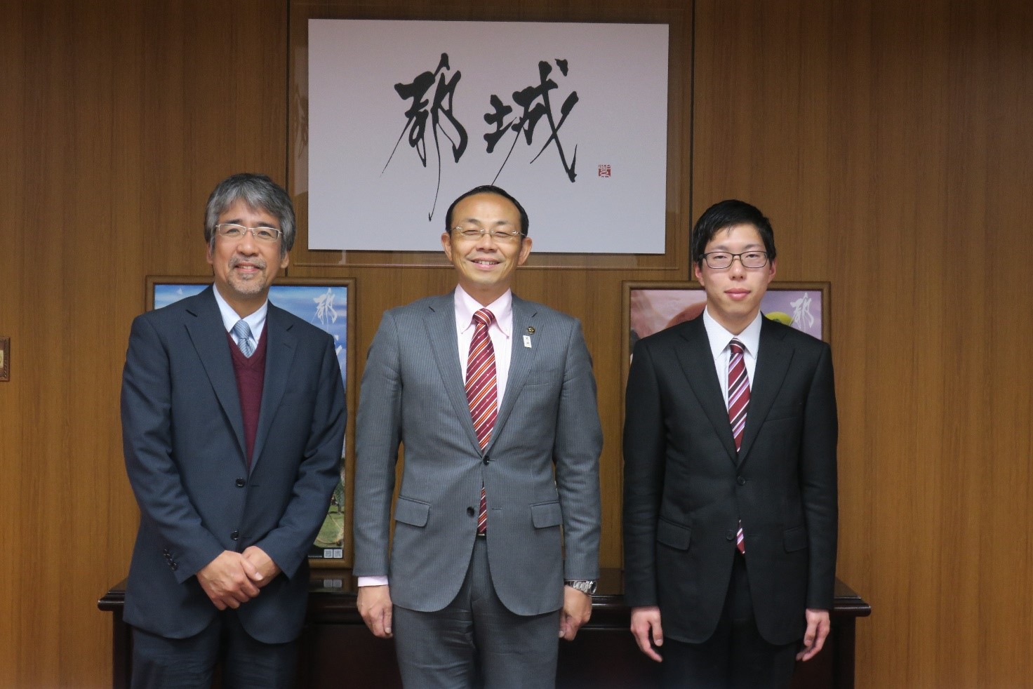 池田宜永都城市長(中央)に研究報告をさせて頂いた関西剛康教授(左)と坂上純一君(右)