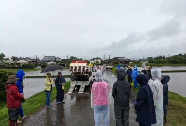 あいにくの小雨が降る中での体験でしたが、ご指導いただいた管理委託農家の松山様から「田植え(稲苗)としては、最良の天候です」とのご説明に、皆の気持ちは“晴れ”ました。