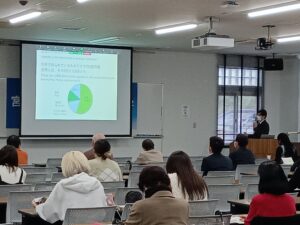 最後に登壇した本学健康栄養学部 渡邉純子教授は、「食でつながる宮崎と世界」と題して、前の二人の登壇者の講演を振り返りながら、宮崎の子どもたちの食をめぐる課題と可能性を論じました。議論の中で渡邉教授は、私たちがアフリカの食や人々に思いをめぐらせる際に、「彼らから何を学べるか」を問い、対等な関係の中で対話することの大切さにも触れました。