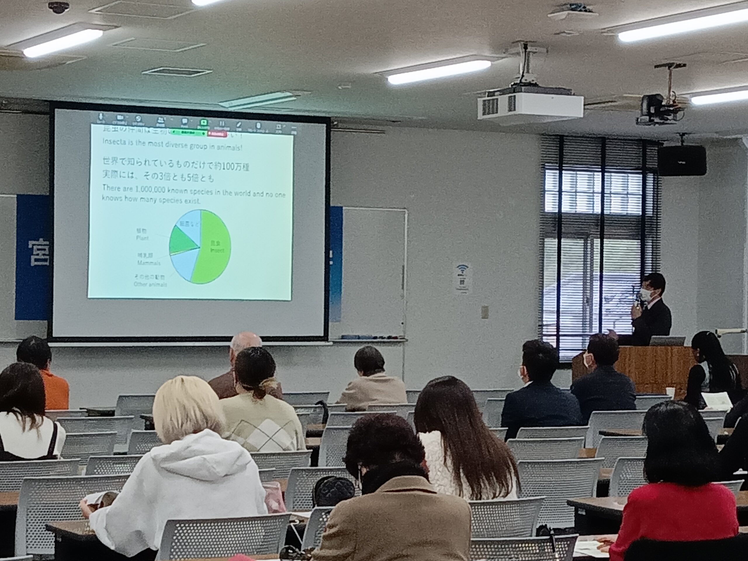 初めに、本学環境園芸学部 新谷喜紀教授が、講演「アフリカと日本の昆虫を通したつながり」を行い、人間の移動に伴う昆虫の居住域の拡大や、気候変動に伴う生態の変化など、小さな昆虫たちのグローバルなダイナミズムが紹介されました。また、とかく「害虫」と敬遠されがちな昆虫たちを食物として捉えなおそうという現代の取り組みにも触れ、貴重なたんぱく源としての昆虫食の可能性も議論されました。