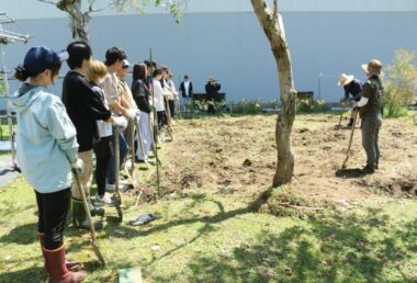 講義初日は好天に恵まれ、学生たちは4〜5名ずつのチームを組んで活動。共同農園の設計や整備、栽培するハーブの選定について協力しながら取り組みました。実際に手を動かしながら作物と向き合う体験を通じて、学科の枠を越えた交流が自然に生まれました。