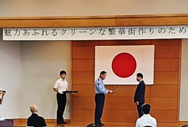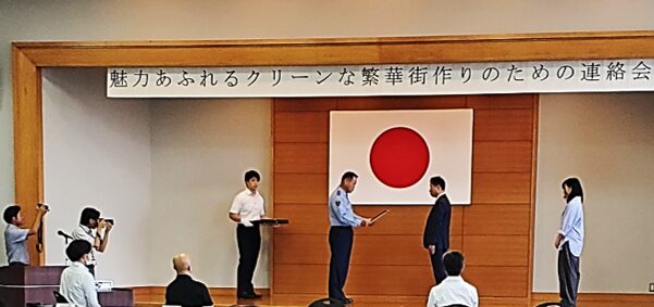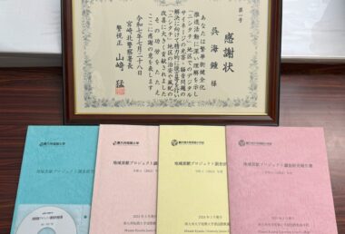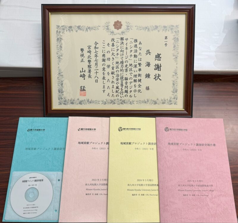 7月28日、南九州大学短期大学部の学生および呉海鍾教授が取り組んでいる宮崎繁華街健全化推進活動の功績が評価され、宮崎北警察署より感謝状が授与されました。今回の感謝状は、3年間にわたるPBL(Project Based Learning / 課題解決型学習)型授業の地域貢献プロジェクトにおける、科学的調査から政策提案及び行政制度化までの一貫した取り組みが評価されたものです。