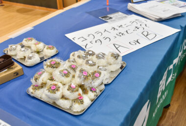 近年、都城市内の河川で生息域を拡大している外来魚コウライオヤニラミに関心を持ってもらうため、コウライオヤニラミのふりかけとタラのふりかけを使ったおにぎりをブースを訪れた皆さんに食べ比べてもらい、どちらがコウライオヤニラミなのかを当ててもらうクイズを実施しました。