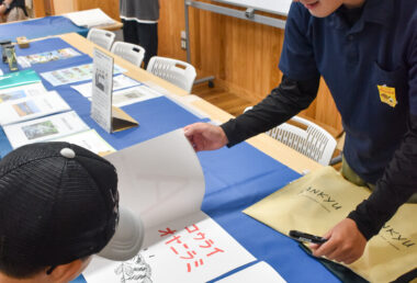 本学のブースでは、このほか、都城市の河川にいる魚類の図鑑の展示のほか、コウライオヤニラミ料理レシピの配布や、コウライオヤニラミの持ち出し禁止シールを貼ったカトラリーの配布を行いました。