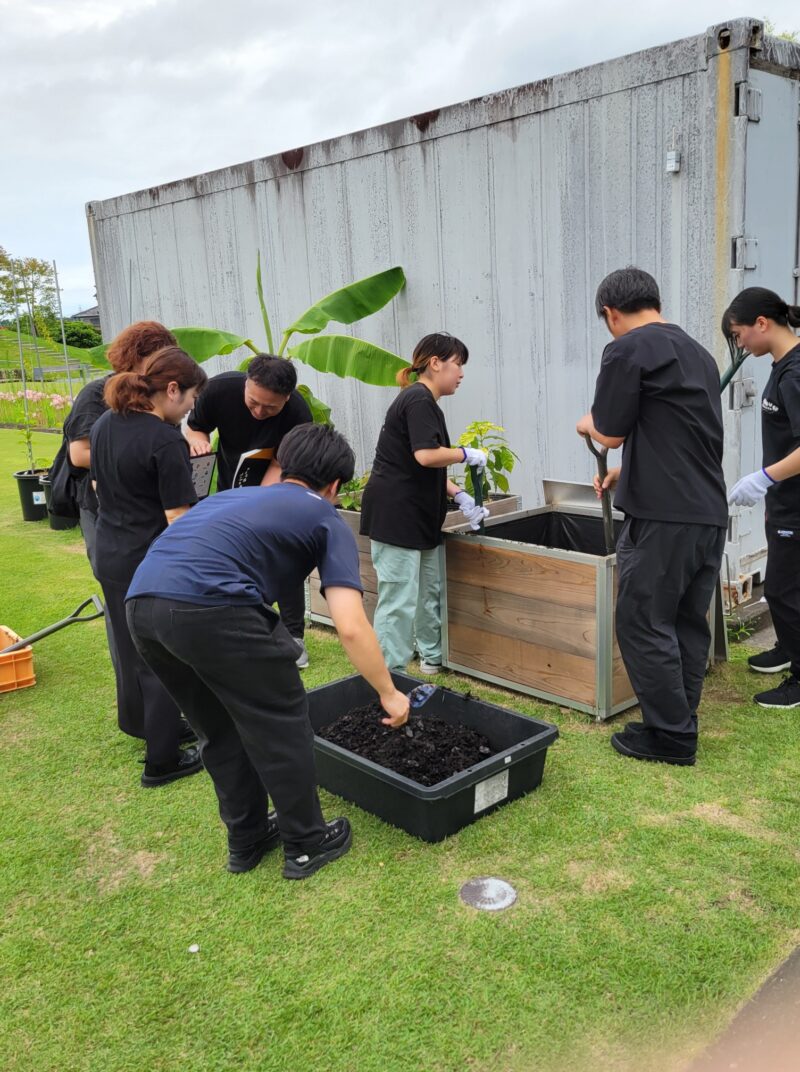 この取り組みは、2026年春に開業する霧島酒造とスターバックスのコラボレーション施設で実施する活動で、2025年6月21日(土)に開催されたワークショップをきっかけに本学の学生も参加し、たい肥づくりを実際に体験しました。現在は、たい肥をかき混ぜる「切り返し」という作業を行いながら、発酵の進み具合を継続して観察しています。