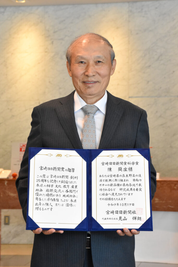 本学環境園芸学科の陳蘭庄教授(蔬菜園芸学研究室)が、各分野で優れた功績を挙げ、宮崎県の発展に貢献した個人や団体を顕彰する「第61回宮崎日日新聞賞」の「科学賞」に選ばれました。宮崎日日新聞賞は、同紙創刊25周年を記念して1965(昭和40)年に創設され、これまでに285個人、240団体が受賞しています。陳教授は、宮崎市の宮日会館で10月17日に開かれた贈呈式に出席し、宮崎日日新聞社の見山輝朗社長から、賞状と副賞を受け取りました。