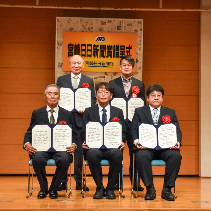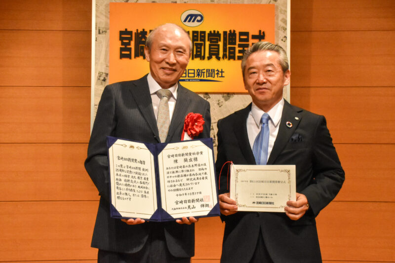 本学環境園芸学科の陳蘭庄教授(蔬菜園芸学研究室)が、各分野で優れた功績を挙げ、宮崎県の発展に貢献した個人や団体を顕彰する「第61回宮崎日日新聞賞」の「科学賞」に選ばれました。宮崎日日新聞賞は、同紙創刊25周年を記念して1965(昭和40)年に創設され、これまでに285個人、240団体が受賞しています。陳教授は、宮崎市の宮日会館で10月17日に開かれた贈呈式に出席し、宮崎日日新聞社の見山輝朗社長から、賞状と副賞を受け取りました。