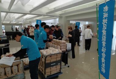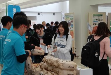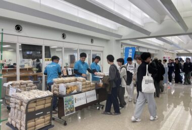 キャンパス内の配付場所には、配付開始前から新米を心待ちにした学生が長蛇の列を作っており、大盛況でした。受け取った学生たちの顔には自然と笑顔が広がり、「お米の値上げが続く中でとても助かる」「スーパーで買うのを諦めてたので、本当にありがたい」などの声が次々と寄せられました。