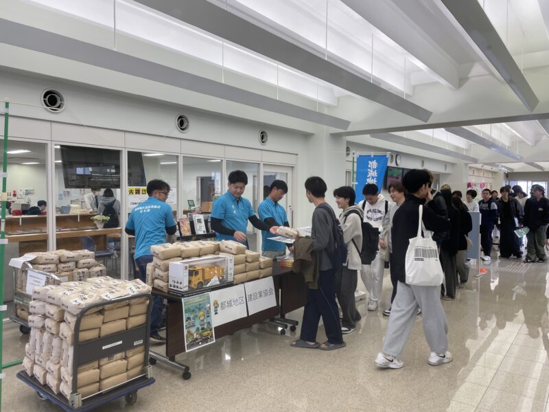 今回の寄附は同協会の地域貢献活動の一環として実施されたもので、都城地区建設業協会青年部の方々によって学生へ新米が手渡されされました。