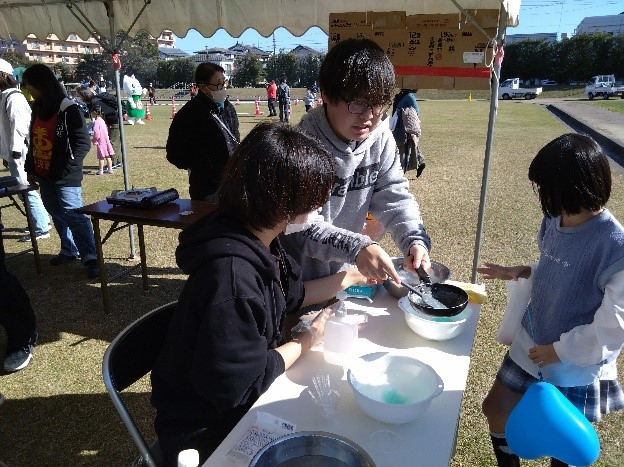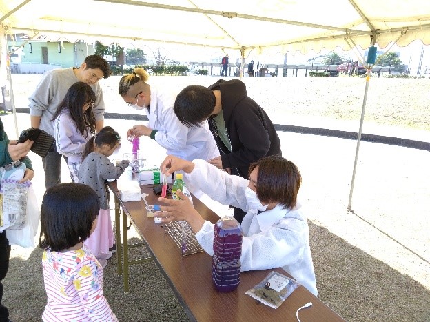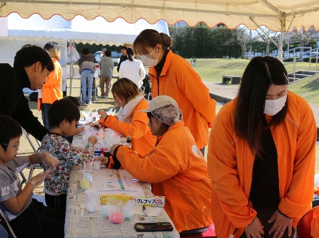 12月7日(日)、宮崎西地区交流センターで開催された「健康ふくしまつり」(中央西まちづくり推進委員会主催)に、本学食品開発科学科の学生たちが参加し、「わんぱく広場」と題して子どもたちに様々な体験を提供しました。