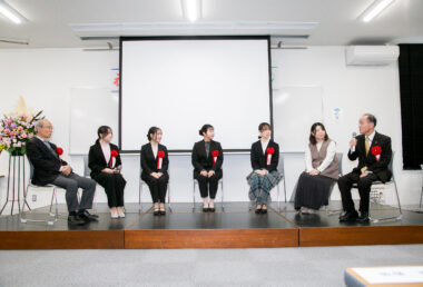 第2部では、卒業生とかつて教鞭をとっていた教員によるトークセッションを実施。横堀学科長がコーディネーターを務め、当時の思い出やエピソードを交えながら、半世紀以上にわたる「ナンタン」の歩みを振り返りました。このほか、旧南九州短期大学卒業生で、現在は特別支援学校に勤務しながら、アーティストとして絵を発表している野本龍一さんが自身の作品を紹介したり、シンガー・ソングライターとして活躍する永吉愛さんが学園歌を披露したりするなどして、会場は温かな雰囲気に包まれました。