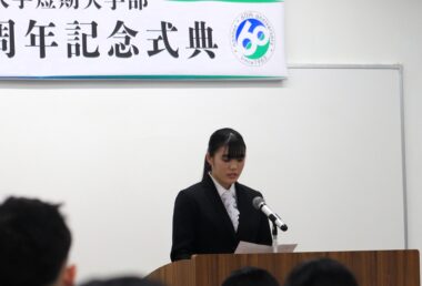 創立六十周年を迎え、これまで本学を支えてきた教職員、地域の皆さま、そして先輩方への深い感謝の思いを胸に、この学び舎で成長できる喜びを新たにしています。六十年の歴史は、一人ひとりの想いが重なり紡がれてきたものであり、私たちも歴史を未来へと繋いでいく存在です。ここで得た学びや出会い、想いを心に刻み、卒業後も社会や次の世代へ受け継いでいく決意をもって、これからも歩み続けていきます。