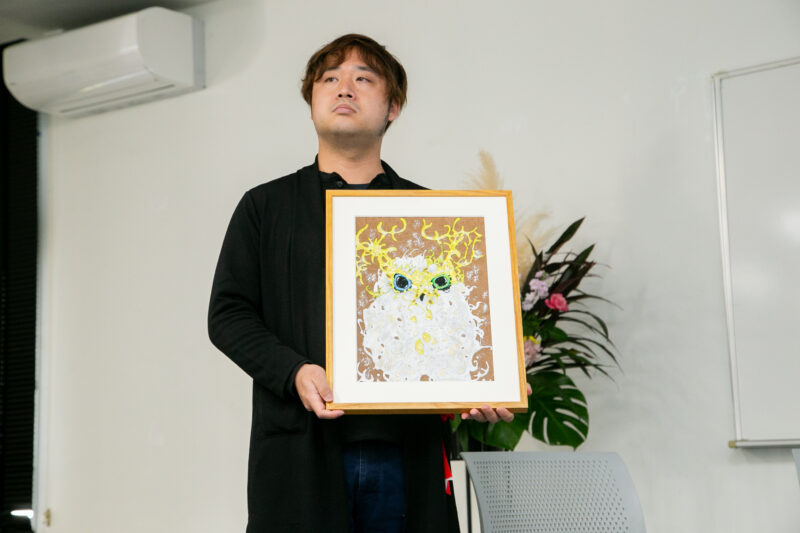 第2部では、卒業生とかつて教鞭をとっていた教員によるトークセッションを実施。横堀学科長がコーディネーターを務め、当時の思い出やエピソードを交えながら、半世紀以上にわたる「ナンタン」の歩みを振り返りました。このほか、旧南九州短期大学卒業生で、現在は特別支援学校に勤務しながら、アーティストとして絵を発表している野本龍一さんが自身の作品を紹介したり、シンガー・ソングライターとして活躍する永吉愛さんが学園歌を披露したりするなどして、会場は温かな雰囲気に包まれました。