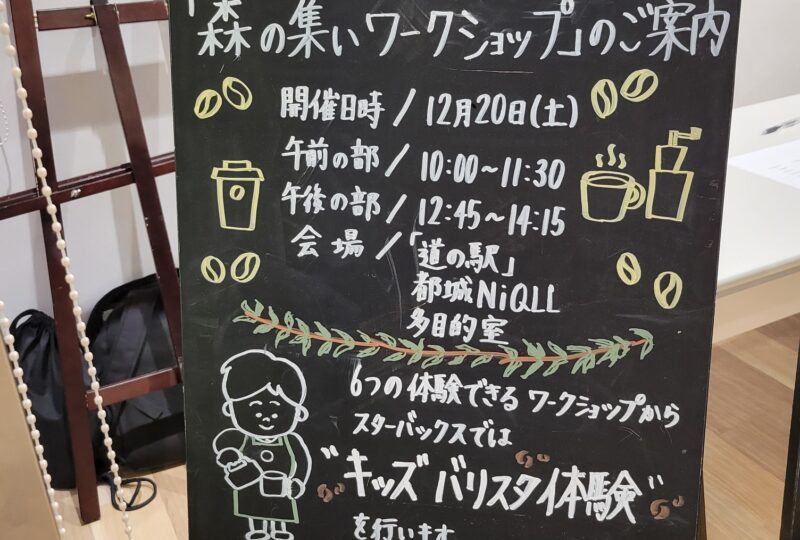 2025年12月20日(土)、「道の駅」都城NiQLLで開催された「森の集い場ワークショップ」~木とコーヒーの香りに包まれて、休日のひと時をのんびり過ごしませんか~に、環境園芸学科の前田隆昭教授(果樹園芸学)と学生5人が参加しました。今回のワークショップは、「スターバックス コーヒー ジャパン」と「霧島酒造」、そして地域と協働で国内外の森で森林保全活動を行っている団体「more trees」、「都城市」が主催したものです。スツールづくりやキッズバリスタ体験など多彩なワークショップが行われ、多くの親子連れや市民でにぎわいました。