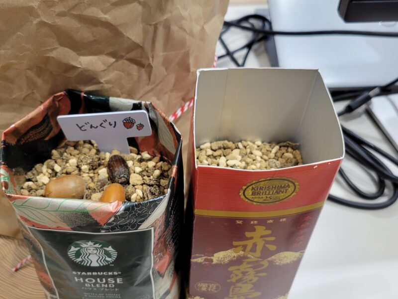 本学学生らは、このうち「どんぐり芽吹くかな!?実験」にファシリテーターとして参加。焼酎パックやコーヒー豆の袋をリサイクルしたポットに培土を入れ、参加者がどんぐりの種子を植える作業をサポートしました。