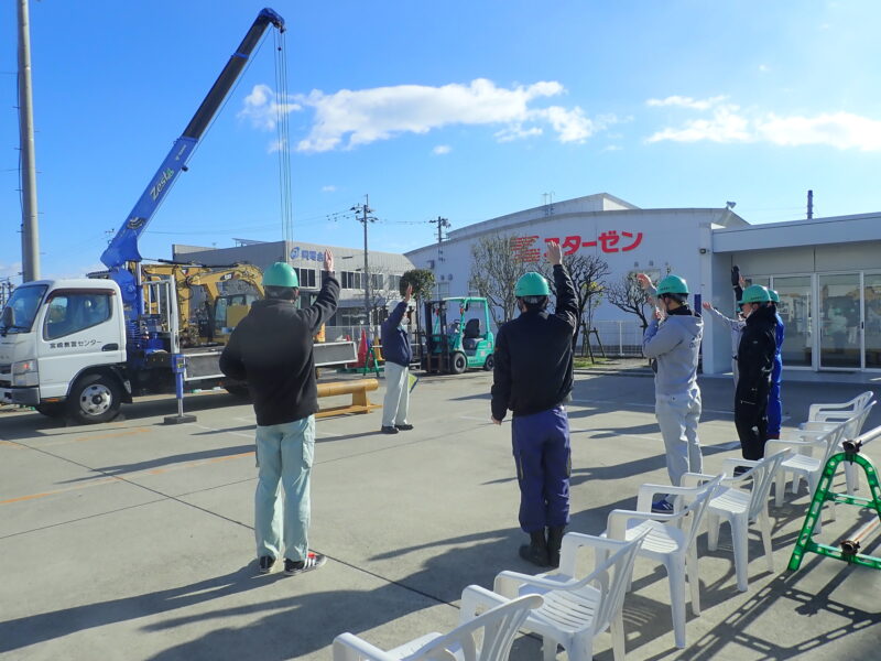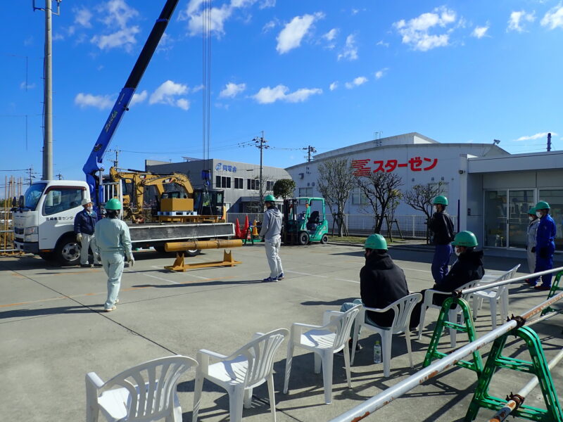合図の確認や玉掛け方法(あだ巻き)、誘導方法などの作業手順を確認し、実技練習が行われました。クレーンオペレーターとの手順確認や、始業前・終業後のワイヤー確認など、点検・確認の重要性も学べました。確認試験では、テンポよくオペレーターに対して合図を出していました。講習前とは見違え、堂々と指示を出すことができました。安全な作業に留意し、確認試験を終えました。全員合格することができました。