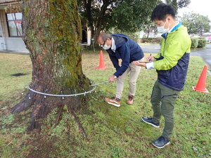 3部. 校内樹木の点検では、学内の樹木を対象に、ルートカラ―(根張り)の有無、腐朽の入り具合や剪定跡の確認、穿孔性害虫食害跡の確認など、予防や対処を交えて進みました。